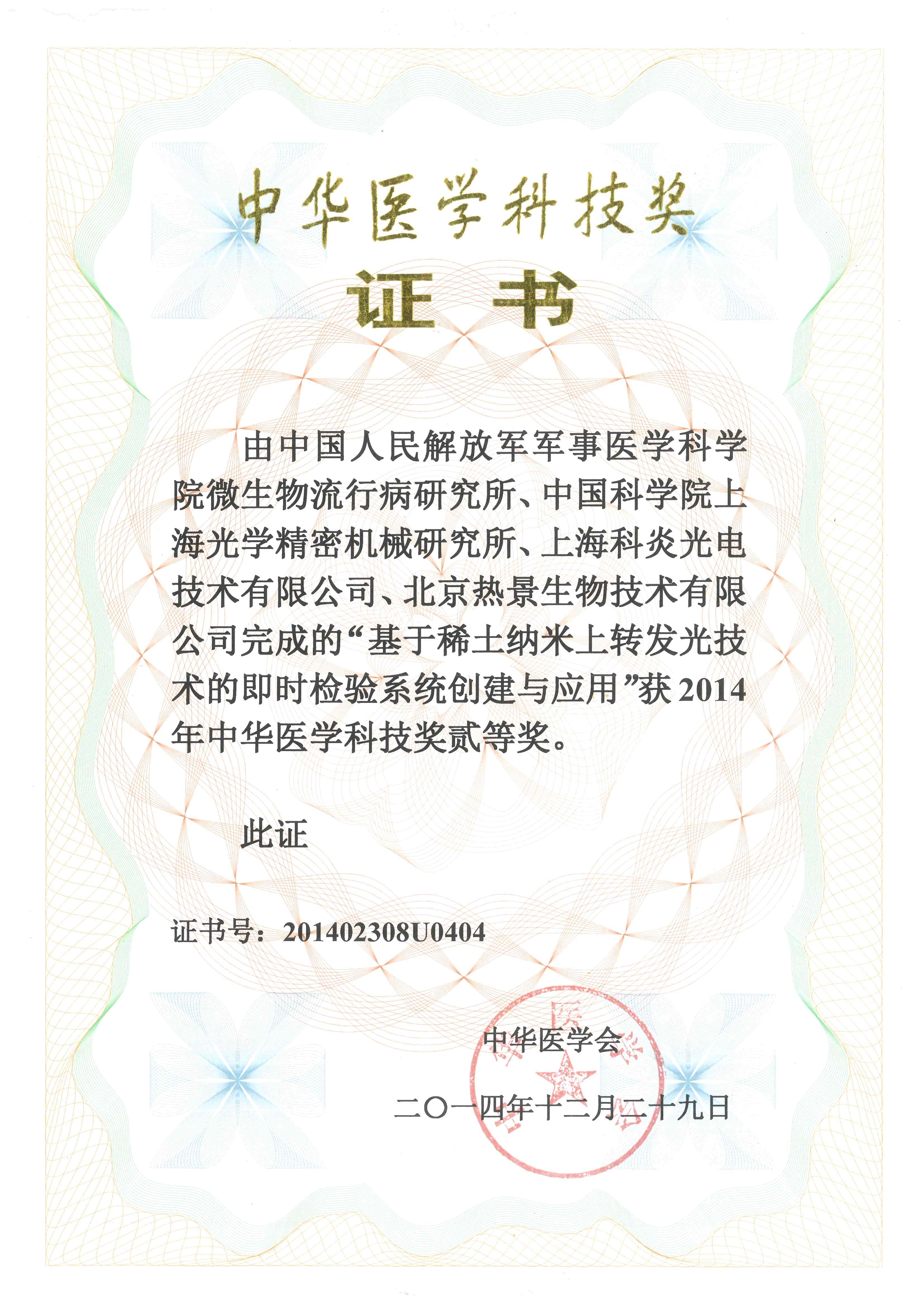 由北京熱景生物技術(shù)有限公司參與完成的“基于稀土納米上轉(zhuǎn)發(fā)光技術(shù)的即時(shí)檢驗(yàn)系統(tǒng)創(chuàng)新與應(yīng)用”榮獲2014年中華醫(yī)學(xué)科技獎(jiǎng)貳等獎(jiǎng)。