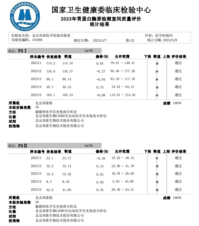 近日,國家衛(wèi)生健康委臨床檢驗(yàn)中心(NCCL)公布了2023年多項(xiàng)全國臨床檢驗(yàn)室間質(zhì)量評(píng)價(jià)結(jié)果。熱景生物旗下熱景醫(yī)學(xué)檢驗(yàn)實(shí)驗(yàn)室以100分的優(yōu)異成績通過“胃蛋白酶原”“血清降鈣素原”“N末端前腦鈉肽”“心肌標(biāo)志物”等室間質(zhì)評(píng)項(xiàng)目。同時(shí),熱景生物參與的上海市臨床檢驗(yàn)中心2023年第一次能力驗(yàn)證項(xiàng)目,包括B型鈉尿肽/N端-B型鈉尿肽前體、AFP異質(zhì)體比率、肌鈣蛋白I、降鈣素原等項(xiàng)目均通過驗(yàn)證,充分彰顯了熱景生物穩(wěn)定可靠的實(shí)驗(yàn)室質(zhì)量管理和檢測(cè)能力,以及強(qiáng)大的產(chǎn)品和技術(shù)實(shí)力!