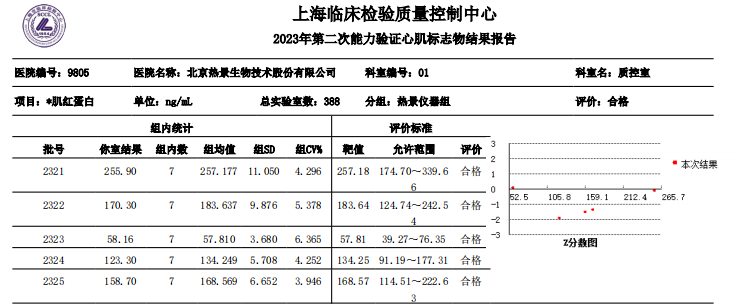 近日,國家衛(wèi)生健康委臨床檢驗(yàn)中心(NCCL)公布了2023年第二次全國臨床檢驗(yàn)室間質(zhì)量評價(jià)結(jié)果。經(jīng)了解,熱景生物心肌標(biāo)志物(肌酸激酶同工酶、肌紅蛋白、肌鈣蛋白I)、血清降鈣素原項(xiàng)目的上轉(zhuǎn)發(fā)光及化學(xué)發(fā)光兩大平臺(tái)產(chǎn)品,以及D-二聚體、白介素6、胃蛋白酶原項(xiàng)目的化學(xué)發(fā)光平臺(tái)產(chǎn)品均滿分通過此次室間質(zhì)量評價(jià)。同時(shí),熱景生物參與的上海臨床檢驗(yàn)中心2023年第二次能力驗(yàn)證活動(dòng),包括AFP異質(zhì)體比率、B型鈉尿肽/N末端B型鈉尿肽前體、心肌標(biāo)志物(肌酸激酶同工酶、肌紅蛋白、肌鈣蛋白I)、血清降鈣素原等項(xiàng)目在內(nèi)的產(chǎn)品均通過評價(jià)。