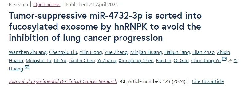 4月23日,福建醫(yī)科大學(xué)研究團(tuán)隊在期刊《Journal of Experimental & Clinical Cancer Research》上發(fā)表了題為“Tumor-suppressive miR-4732-3p is sorted into fucosylated exosome by hnRNPK to avoid the inhibition of lung cancer progression”的研究論文,本研究為非小細(xì)胞肺癌提供了一個有前景的生物標(biāo)志物,并通過靶向hnRNPK阻止miR-4732-3p從非小細(xì)胞肺癌細(xì)胞中“外泌體逃逸”,為非小細(xì)胞肺癌治療開辟了一條新的途徑。文章共同作者包括北京熱景生物技術(shù)股份有限公司高琦博士、劉城秀博士,熱景生物作為合作單位為研究的實施提供了重要支持。