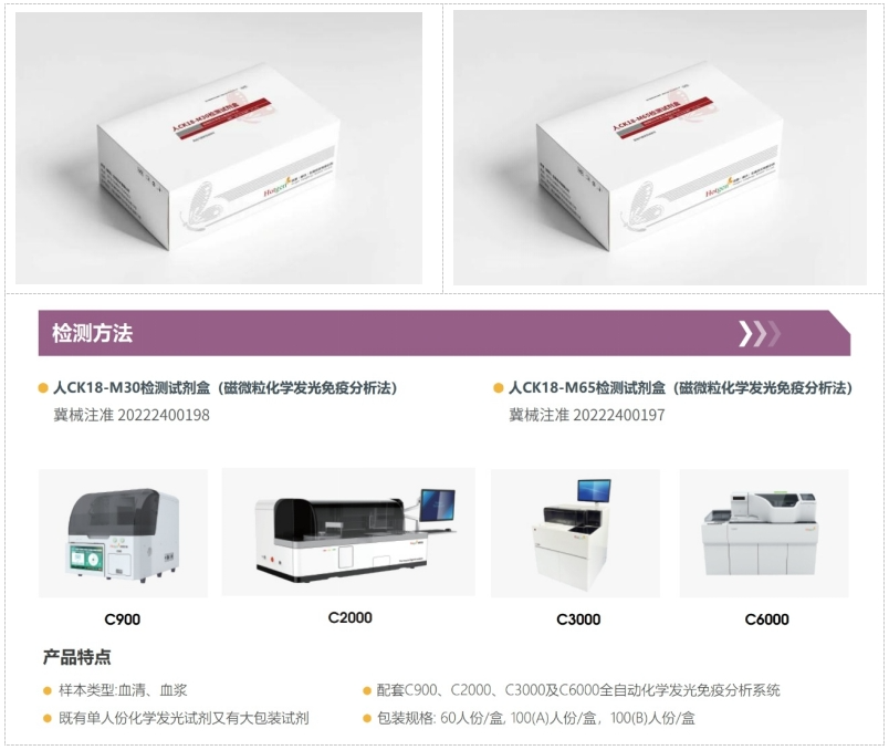 熱景生物新品-CK18(化學發(fā)光法國內(nèi)第一證)采用先進的化學發(fā)光免疫分析技術,具備極高的靈敏度和特異性,能夠準確檢測血清中的CK18-M30和CK18-M65水平。